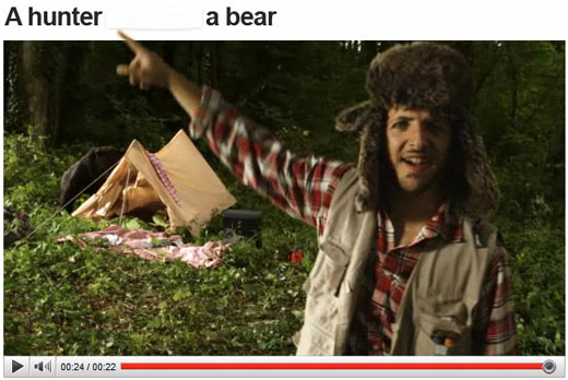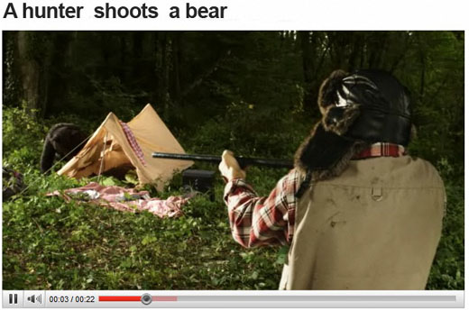 廣告一開始看起來很像是一般很常見的、很普通的YouTube影片,當獵人正準備開槍射殺黑熊的時候,一時心軟下不了手,就拿了YouTube影片右邊廣告區塊上面的“修正帶”把YouTube影片標題中的“shoots”塗掉了!留下的空白就讓網友自己填上,看你填什麼字就自動“演”給你看!